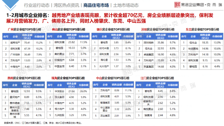 具体看,今年1-2月,越秀地产业绩表现亮眼,累计收金超70亿元;保利发展2月营销发力,广、佛排名上升,同时入榜肇庆、东莞、中山五强。