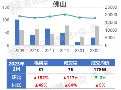 佛山:春节过后,在“认房不认贷”等一系列利好新政的带动下,改善需求得以释放,佛山楼市热度持续上涨,单月新房成交量突破75万㎡,为近十年2月同期高位;本月市内多个标杆项目降价促销,加上部分外区个盘在渠道带客积极推动下成交增多,影响全市成交均价环比微跌。