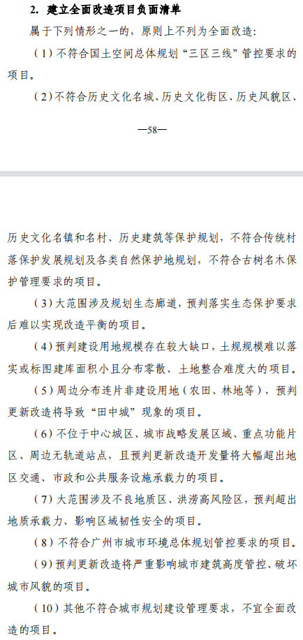 此次《城更规划》建立全面改造的正面和负面清单。探索多模式推进旧村改造。以“留改拆”并举推动旧城镇混合改造;结合实际采用政府收储、自主改造等模式推动旧厂房改造。