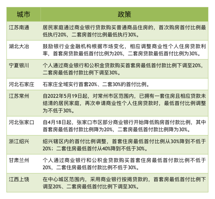 中指研究院数据显示,今年截至5月23日,全国已有近40城调整优化商贷政策。另据澎湃新闻不完全统计,4月以来,已有江苏南通、湖北大冶、宁夏银川、河北石家庄、江苏常州、河北张家口、浙江绍兴、甘肃兰州、江西上饶等地调整商贷首付比例,多地在下调首套房首付比例至20%的同时,降低二套首付比例至30%。以江苏南通为例,5月20日,南通市住房和城乡建设局与南通市发改委等七部门联合印发《关于促进房地产市场平稳健康发展的通知》,《通知》明确,居民家庭通过商业银行贷款购买普通商品住房的,首次购房首付比例较低执行20%,二套房首付比例较低执行30%。居民家庭购买普通住房商业贷款利率下限执行全国较低标准,首套住房商业贷款利率下限执行贷款市场报价利率(LPR)减20个基点,二套房商业贷款利率下限执行现行较低标准。