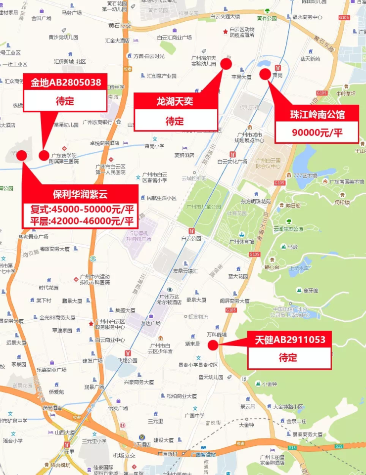 如果按照供货量和地域划分,白云新城可以大致划分为三个区域:西部(保利华润紫云和金地地块)、北部(珠江岭南公馆和龙湖天奕)以及南部(天健地块)。