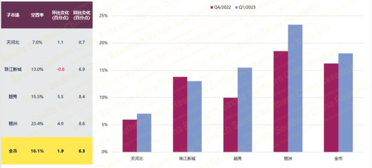 第一季度内,租赁市场活跃度较此前数季大幅提高,租赁问询、租赁成交量均有增长。因此,全市季度净吸纳量环比上升23.9%,至约4.8万平方米。其中,得益于金融等企业租赁需求的释放,珠江新城净吸纳量上升至全市最高的2.4万平方米,占全市总量的50.8%。尽管如此,全市平均空置率仍因新项目影响而结构性环比上升1.9个百分点,至18.1%。
