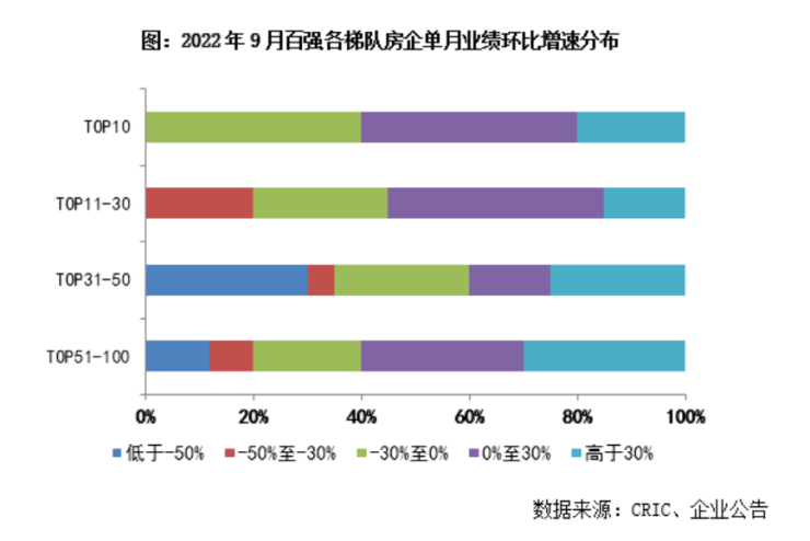 据克而瑞数据,2022年9月超半数百强房企实现单月业绩环比增长,其中30家企业的环比增幅在0%到30%之间,25家企业环比增幅超过30%。如华润、招商、绿地、越秀、仁恒等企业的环比增幅均在35%以上。