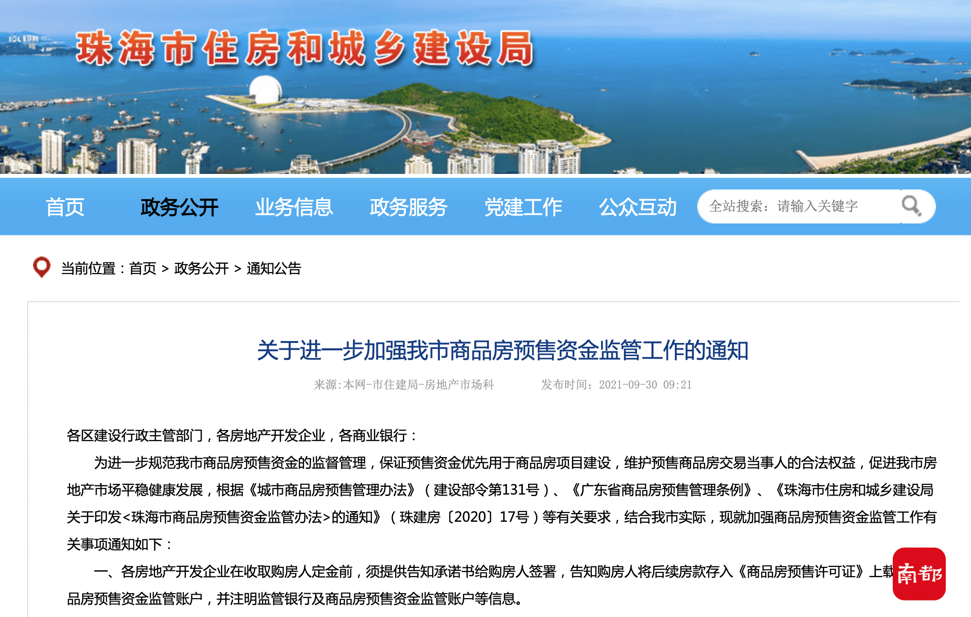 珠海住建局较新通知:加强对开发商预售资金收存情况的检查