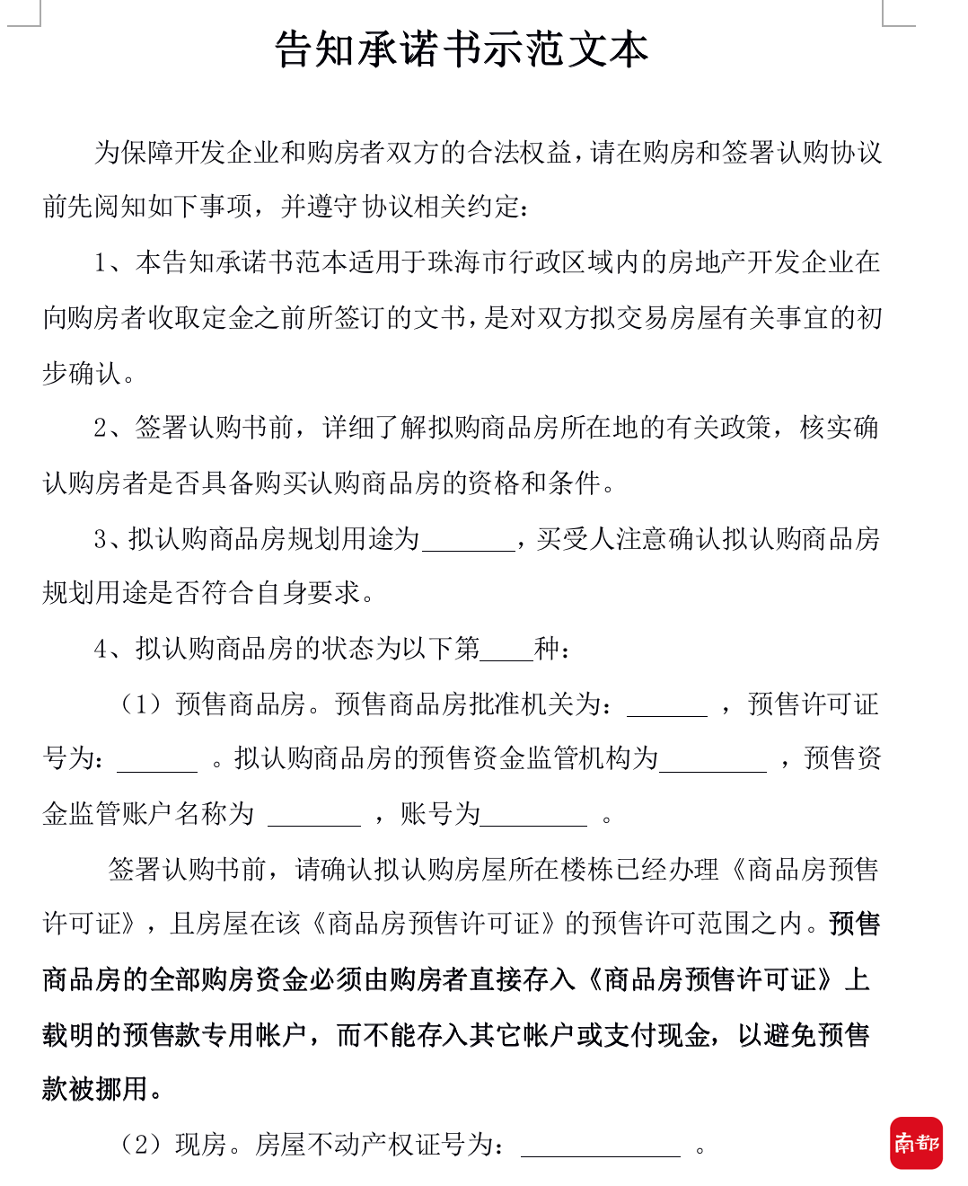 一是要求各房地产开发企业在收取购房人定金前,须提供告知承诺书给购房人签署,告知购房人将后续房款存入《商品房预售许可证》上载明的商品房预售资金监管账户,并注明监管银行及商品房预售资金监管账户等信息。