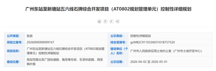 广州东站至新塘站五六线石牌综合开发项目的批前控规,正式公布。