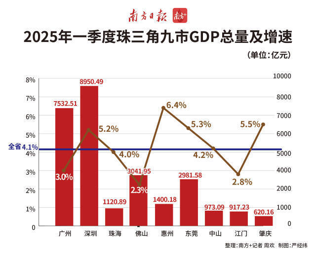 随着佛山公布2025年一季度经济数据,珠三角九市已全部“晒出”经济答卷。九市一季度GDP共计超过2.75万亿元。