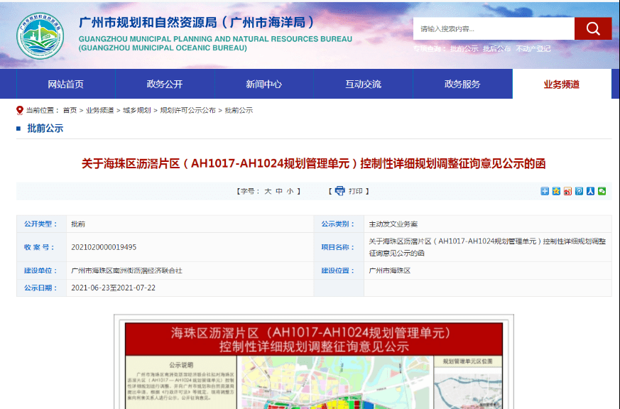 前天(6月23日),广州规划和自然资源局发布关于海珠区沥滘片区(AH1017-AH1024规划管理单元)控制性详细规划调整征询意见公示。