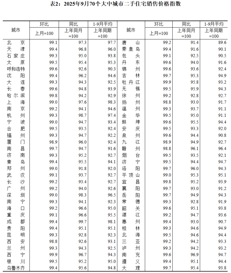 国家统计局数据显示,9月份,一线城市二手住宅销售价格环比下降1.0%,降幅与上月相同。其中,北京、上海、广州和深圳分别下降0.9%、1.0%、0.8%和1.0%。二、三线城市二手住宅销售价格环比分别下降0.7%和0.6%,降幅均扩大0.1个百分点。