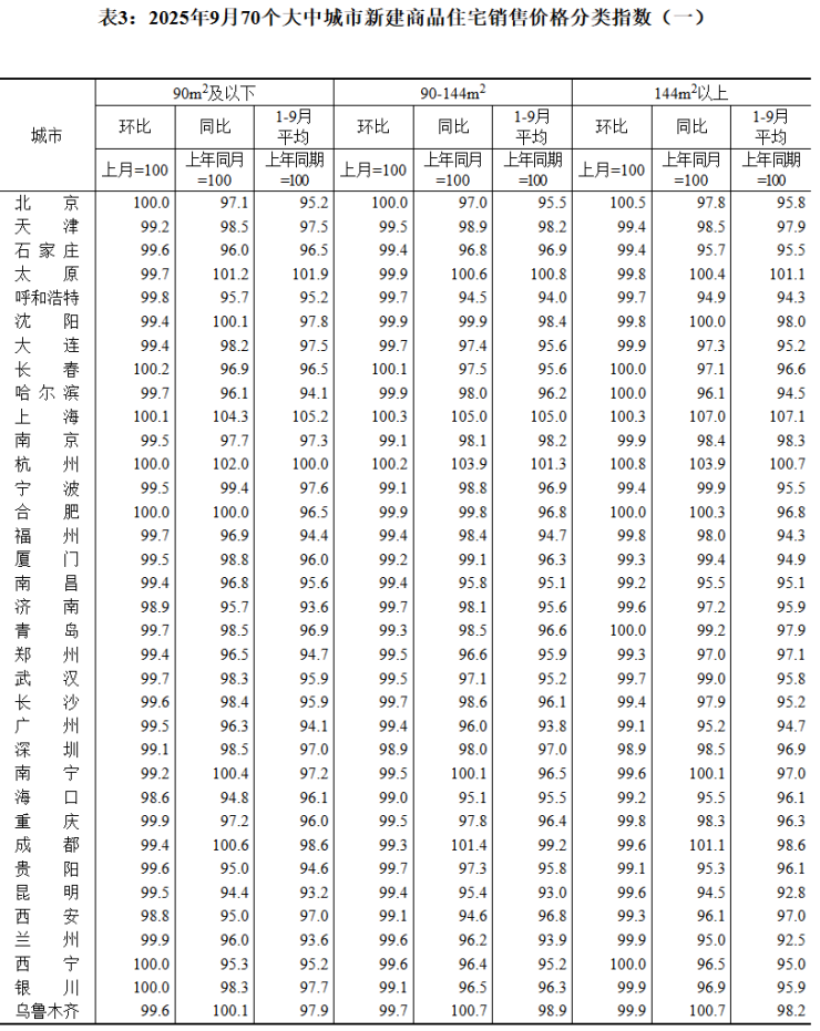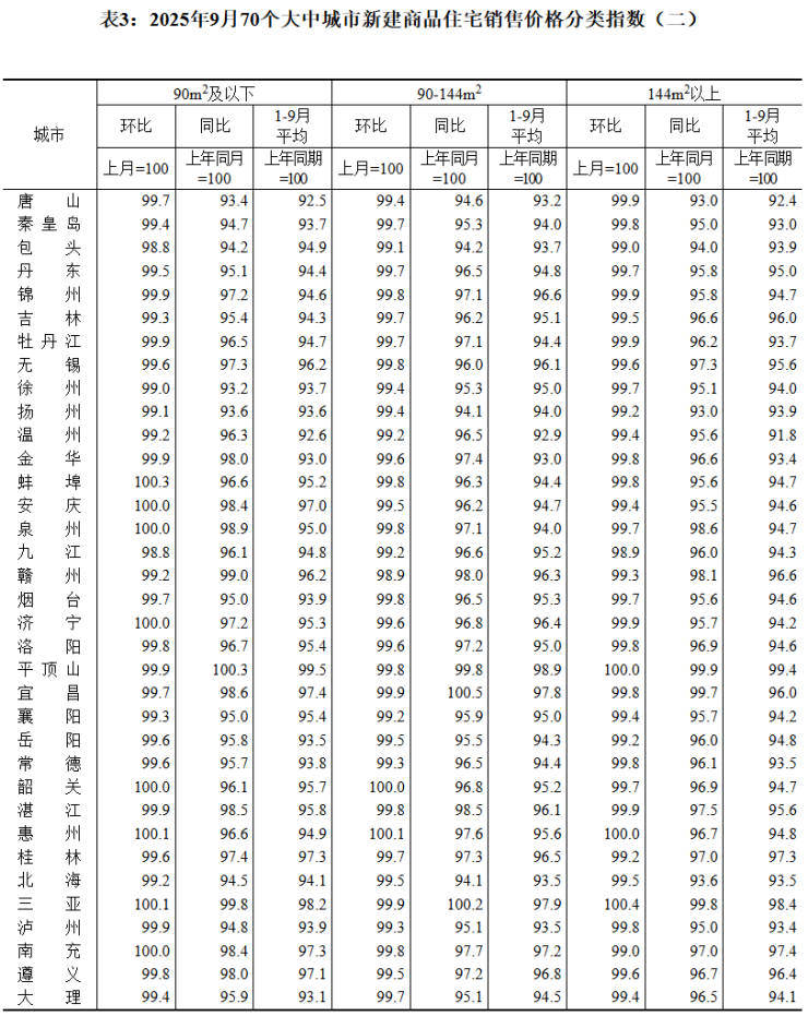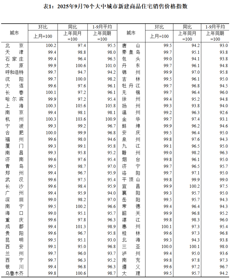 “金九”楼市数据出炉。10月20日,国家统计局发布9月份70个大中城市商品住宅销售价格变动情况。数据显示,9月份,70个大中城市中,各线城市商品住宅销售价格环比下降,同比降幅继续呈收窄态势。