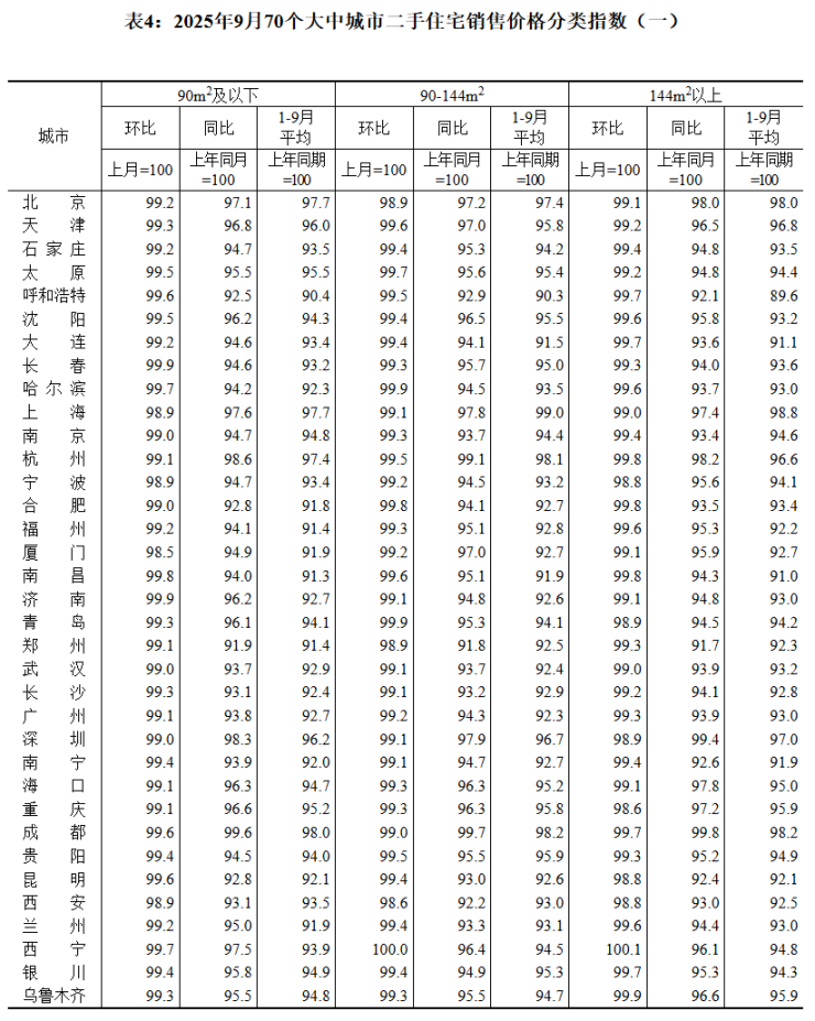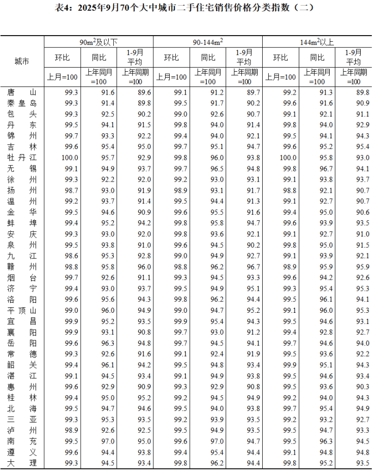 张大伟指出,二手房市场调整压力大于新房,全国二手房均价已连续31个月环比下降,且四大一线城市悉数下跌、跌幅近1%。不过值得关注的是,9月一线城市二手房价格环比降幅与上月持平,二三线降幅进一步扩大,说明政策对价格的托底作用仍需时间显现。