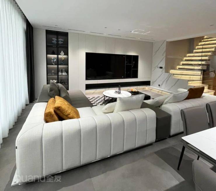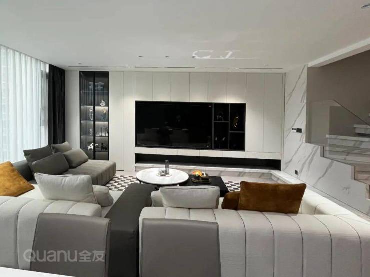 一楼空间主要以白+黑配色为主。整墙电视柜+无拉手设计,不仅看起来简约大气,还拥有超大储物空间,能够让客厅随时保持整洁干净。