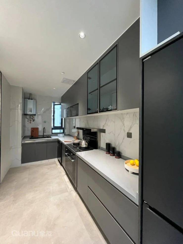 餐厅旁就是开放式厨房,整体布局为L型设计,洗炒动线合理流畅。深色橱柜美观易清洁,搭配免拉手设计更显简约。