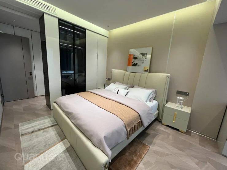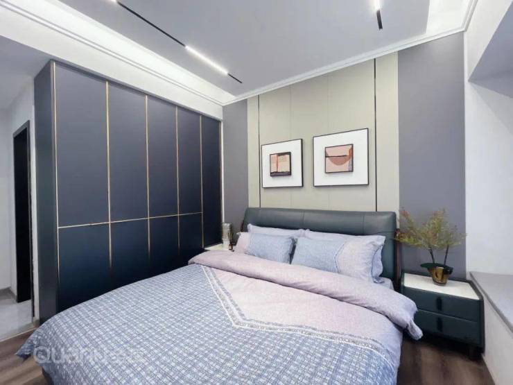 主卧定制整墙衣柜,铝封边+金属线性拉手,勾勒出大气优雅的睡眠氛围。