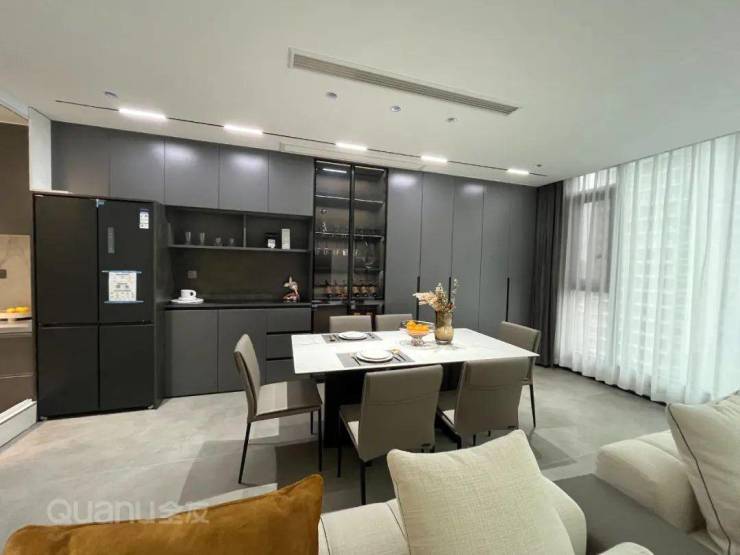 客餐厅一体式设计,靠墙定制整墙餐边柜,部分掩门更换为玻璃柜门,内嵌灯带,珍藏美酒。