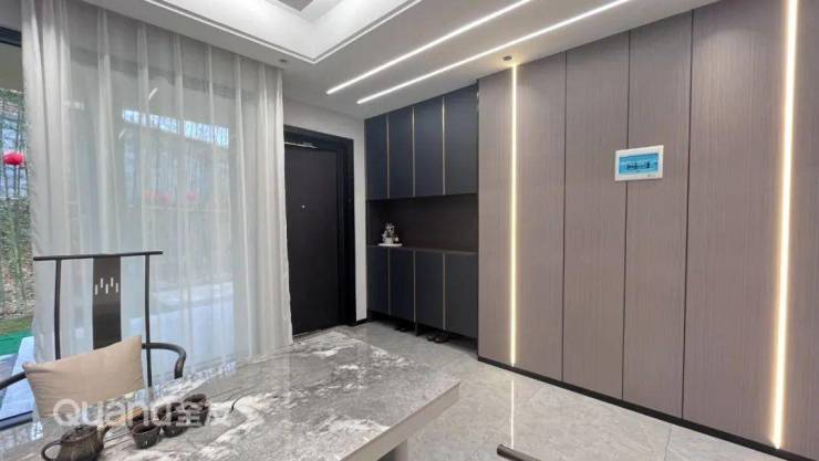 客厅空间很大,沙发后方设计开放式茶室,茶桌搭配智能茶台,休闲、会客都可以在此处进行。