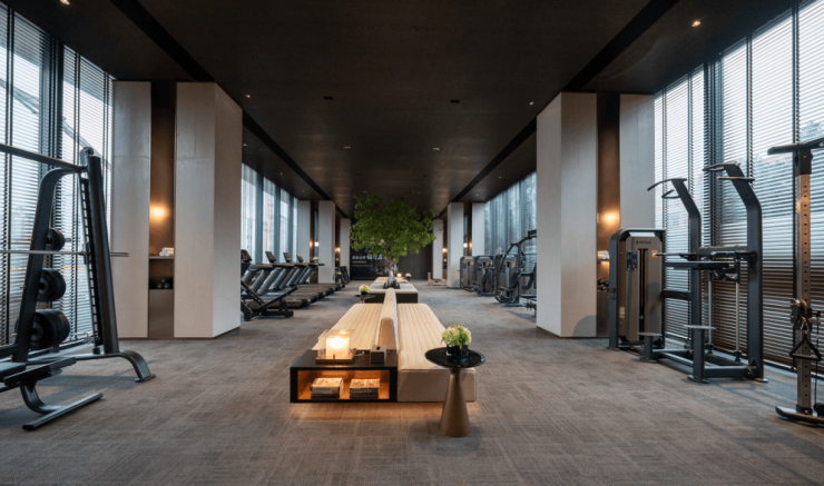 更别说在业主的生活配套上,打造酒店级健身房、行政酒廊等8大功能泛会所,形成业主们「第三空间」。比如,目前开放的健身会所,就采用了大面积的玻璃幕墙,业主一边撸铁、跑步,还能一边欣赏窗外安缦酒店式的风景。