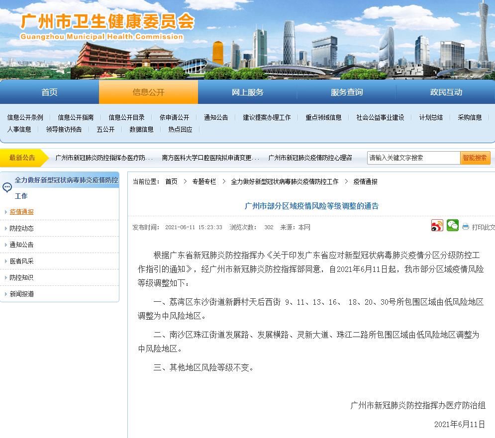 根据广东省新冠肺炎防控指挥办《关于印发广东省应对新型冠状病毒肺炎疫情分区分级防控工作指引的通知》,经广州市新冠肺炎防控指挥部同意,自2021年6月11日起,广州部分区域疫情风险等级调整如下: