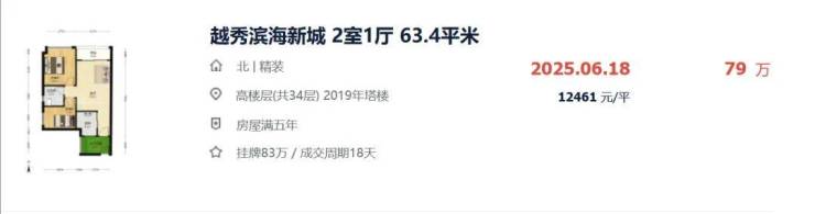 例如这套越秀滨海新城两房一厅户型,成交总价63.4万元,成交周期仅18天,远低于南沙二手房平均周期。