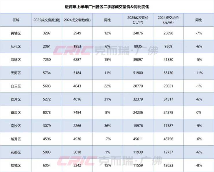 克而瑞数据监测显示,2025上半年广州二手房成交均价26879元/㎡,同比下跌6%。