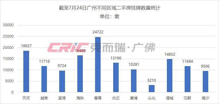 在这其中,番禺、天河、海珠以超1.5万套挂牌套数高居十一区前三位,番禺更是以24722挂牌套数遥遥领先。