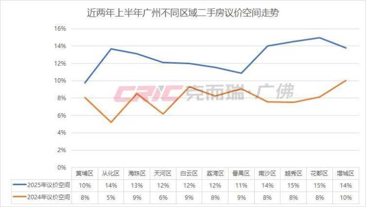 从议价空间来看,克而瑞数据监测显示,广州二手房议价空间12%,同比2024上半年扩大5个百分点,也是近两年来半年度首次超过10%。