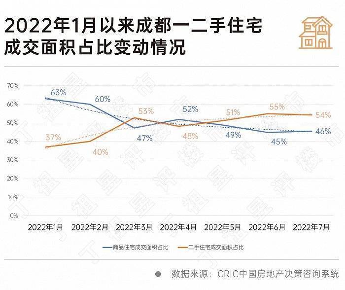CRIC数据显示,自2022年3月以来,成都二手房成交量开始反超新房,2022年1月时成都一二手住宅成交面积还是以新房为主导,达63%,到了7月,成都二手住宅成交面积占比升至54%。