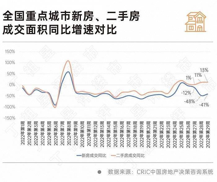 从全国重点城市新房与二手房成交面积同比增速对比来看,一直以来,全国重点城市新房、二手房成交走势几乎同步,一直到2022年第27周(6.27-7.3),也就是7月伊始,全国一二手房市场走势逐渐分化,新房成交同比由正转负,跌幅扩大至40%以上,随后出现收窄,而二手房成交同比增速则逐周回升。