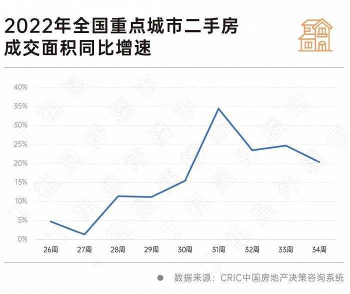 从2022年第26周至第34周(6.20-8.21)的具体情况来看,自7月初起,全国重点城市二手房成交面积同比增速就开始逐步上升,一直到第31周(7.25-7.31)也就是7月底,全国重点城市二手房成交面积同比增速开始出现回调,但仍维持20%以上的增速,与一手房相比明显较好。