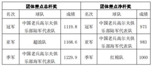 最终老兵陆军代表队夺得两个团队排行榜的冠军,统治了整场比赛,老兵海军代表队获得净杆榜亚军,在总杆榜在亚军超浪队之后获得季军。两个团队榜单老兵队两个代表队上榜,不可谓是本场比赛较大赢家。而红棉队在决赛轮戏剧性的反超,最终收获净杆榜季军。