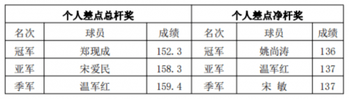 个人奖项方面郑现成、宋爱民、温军红分别获得个人总杆的冠亚季军,个人净杆的前三名分别是姚尚涛、温军红、宋敏。