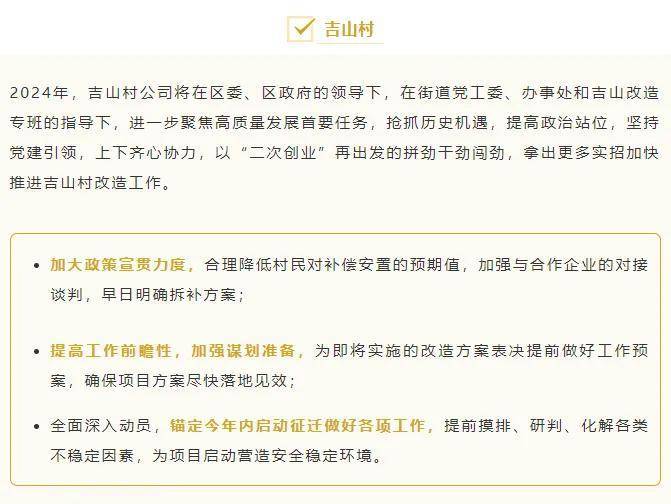 今年2月,天河区高质量发展大会明确提出全面深入动员,锚定今年内启动吉山村征迁,做好各项工作。