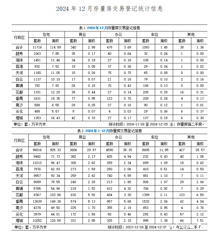 2024年全年,广州二手住宅交易登记96016套,面积925.33万平方米;二手商业是3606套,二手办公是4590套,二手车位是8605个。