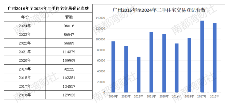 自2016年起,广州住建局官网一直在发布二手住宅交易登记情况,南都湾财社记者统计发现,综合对比近九年的登记数据,2024年的二手楼市交易登记排在近九年的第六名。