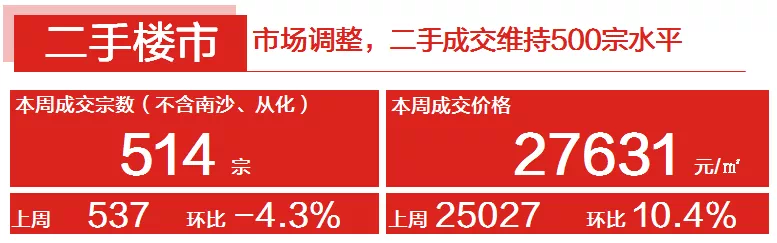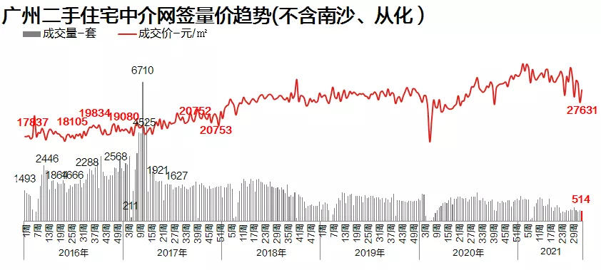 本周二手住宅共成交514宗,环比微跌4.3%。进入8月份以来,广州二手市场成交“不温不火”,周度网签宗数基本保持在500宗水平左右。信贷环境收紧,利率上调,促使置业成本增加,加上目前调控趋紧,导致客户对市场预期发生转变,观望情绪加重,二手成交持续低位。价格方面,本周二手住宅网签均价为27631/平,环比上升10.4%。
