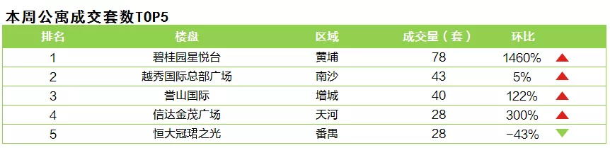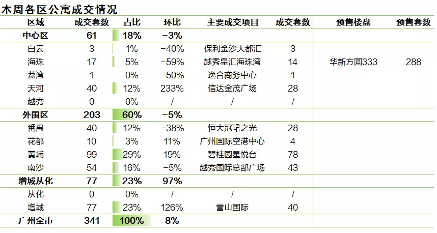 本周海珠区燕岗地铁上盖新盘华新方圆333入市,项目供应288套34-58㎡LOFT公寓,吹风价4万元/㎡。由于若干项目的活动推售带动,本周广州公寓市场成交保持活跃,全市共录得341套成交,环比微涨8%。本周外围区贡献6成交易,黄埔、南沙、番禺区均有不俗表现,各成交99套、54套、40套公寓。其中,黄埔区碧桂园星悦台推出一定幅度的毛坯价格优惠,本周项目跑量78套。南沙区越秀国际总部广场加推4-1栋全新升级产品,项目成交43套公寓。番禺区恒大冠珺之光推出97折VIP折扣及部分一口价单位,本周持续去化40套公寓。中心区公寓成交占比约2成,除天河区外,其余区域表现平平。其中天河区信达金茂广场5米层高LOFT公寓产品首次启动渠道销售,主推46-91㎡LOFT公寓,总价45万元起,限时98折,助力项目跑量28套。增城区则录得126%的涨幅,成交77套公寓。成交主力仍为誉山国际,项目多渠道销售,本周成交40套。