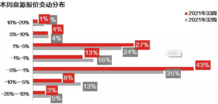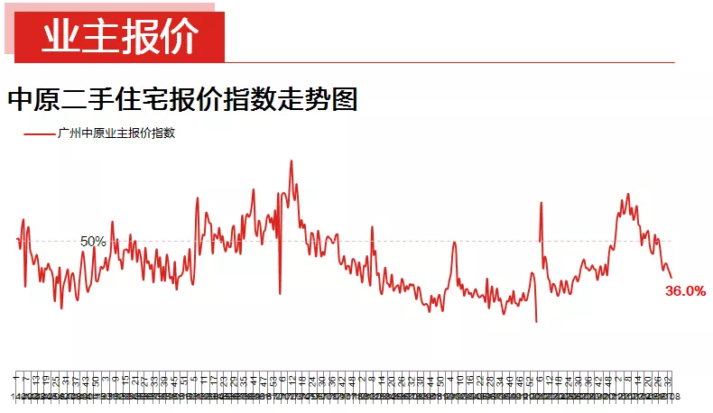 本周业主报价指数为36.0%,环比下降2.0%,指数已经连续4周出现下滑情况。目前整体市场成交相对低迷,客户入市热情偏低,成交周期被明显拉长,促使业主对市场信心不足,指数持续下探。整体看,本周报价下调1%-5%之间的盘源占43.3%,较上周上升8.1%。而报价上调1%-5%以内的盘源占比则较上周增加3.3个百分点,共占27.1%。另外,本周报价上调5%-10%的盘源环比净减0.1个百分点,共占4.1%。