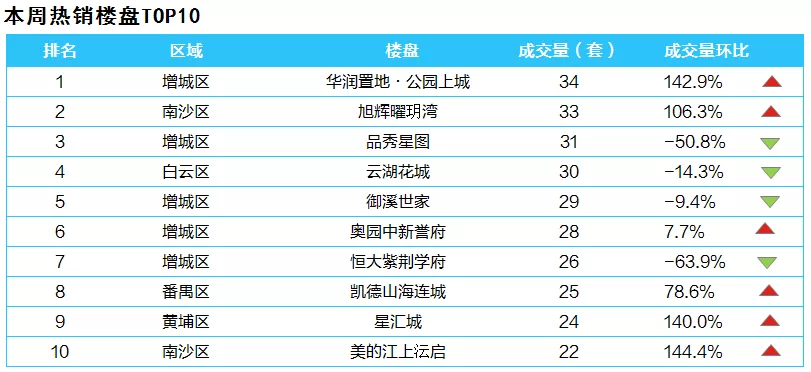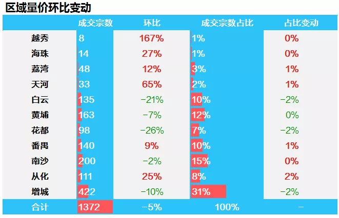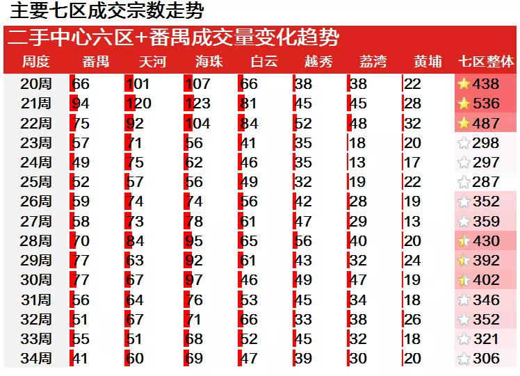 在主要七区中,天河、海珠、黄埔成交略有回升,本周两区分别成交60宗、69宗、20宗,环比分别上涨17.6%、1.5%、11.1%;另外,番禺、越秀、白云三区成交则有不同程度的下滑,本周分别成交41宗、39宗、47宗。