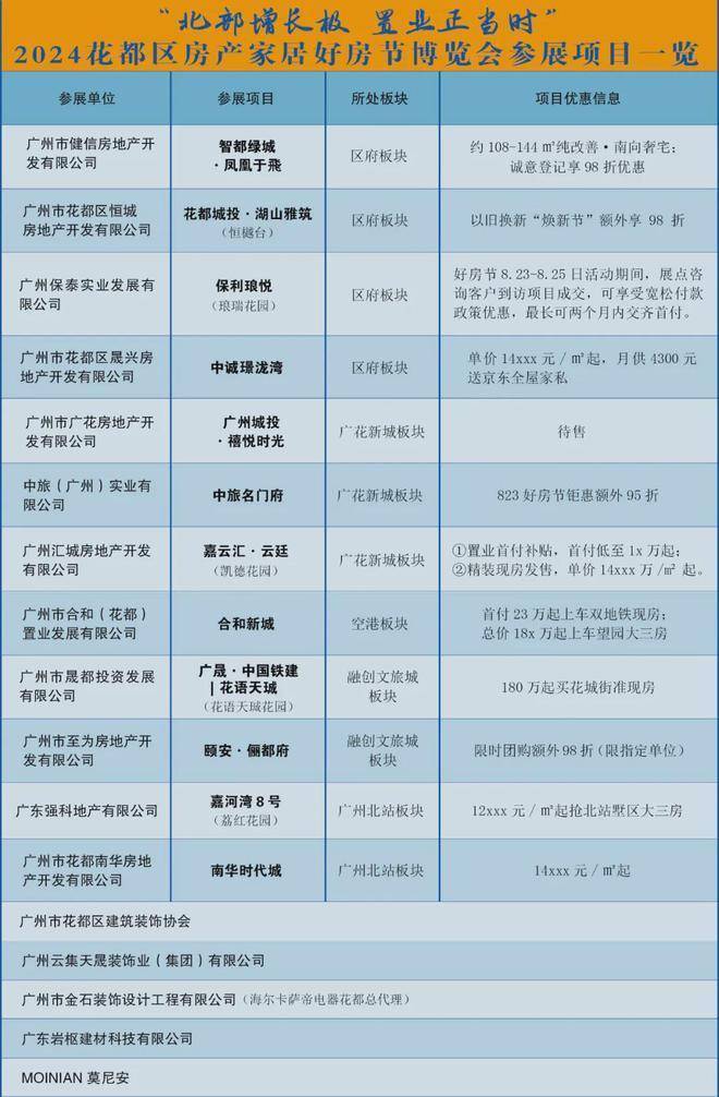 本次活动致力于展示高品质的房地产项目,包括智都绿城·凤凰于飛、花都城投·湖山雅筑(恒樾台)、保利琅悦(琅瑞花园)、中诚璟泷湾、广州城投·禧悦时光、中旅名门府、嘉云汇·云廷(凯德花园)、合和新城、广晟•中国铁建|花语天珹(花语天珹花园)、颐安·俪都府、嘉河湾8号(荔红花园)、南华时代城在内的12大项目,以及广州云集天晟装饰业(集团)有限公司、海尔卡萨帝、岩枢不锈钢、莫尼安等多家品牌家居建材企业,带来额外95折、首付补贴、月供4300元送京东全屋家私等等众多优惠措施,满足不同置业者的需求。