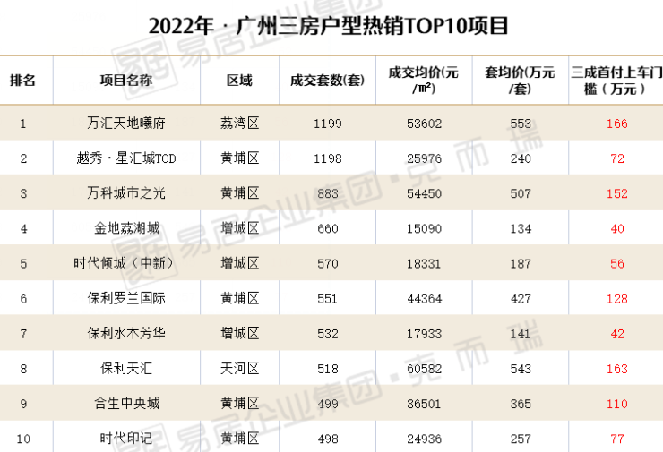 克而瑞统计到,2022年,拿下四房户型“销冠”的是越秀和樾府,项目合计成交1570套四房户型新房,套均价为791万/套,首套三成上车门槛为237万元;另外,排名第二、第三的项目上车门槛也不低,万科城市之光、富力南驰·富颐华庭四房户型三成门槛也超过200万。