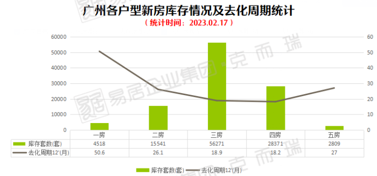克而瑞统计到,目前广州全市二房户型新房库存余近1.6万套,去化周期长达26.1个月;相反,存量更大的三、四房户型,其去化周期却只要一年半左右。