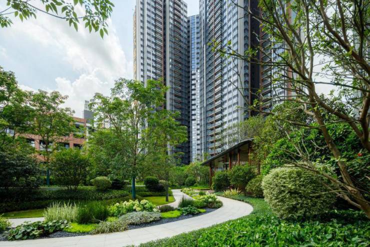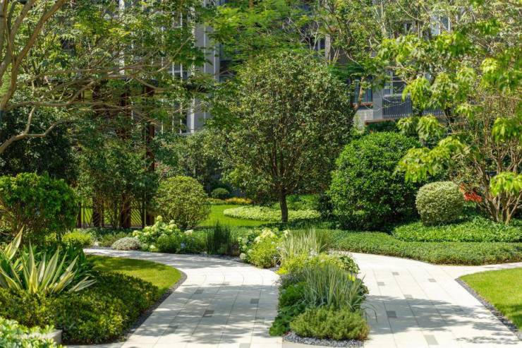 园林整体使用现代风格设计语言,在植物的甄选与搭配上,朴树、红果冬青、黄皮、大腹木棉、澳洲火焰木、红花风铃木等多种名贵树种交错栽植,更显“四季有景”的巧思。林下休憩桌椅为邻里交流提供了静谧场所,中央草坪成为家庭聚会与儿童嬉戏的天然场地,蜿蜒的花园小径让散步成为每日享受,精致的叠水景观则在视觉与听觉上增添灵动趣味。每一处景观配套都经过精心设计,让园林真正融入业主的日常生活。