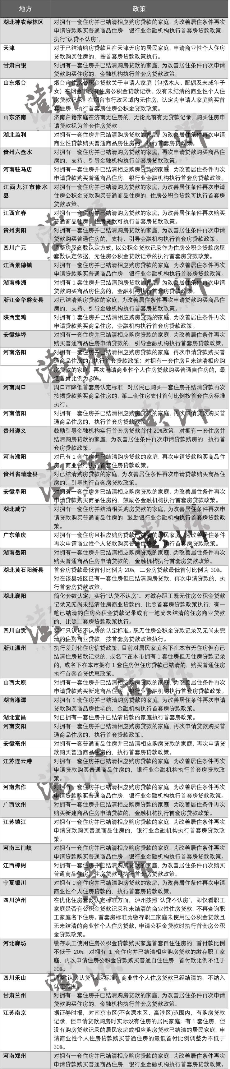 另以湖北神农架林区为例,湖北省神农架林区人民政府印发《关于促进房地产市场平稳健康发展的工作措施》提出,降低商品房首付比例,居民家庭首次购买普通商品住房的商业性个人住房贷款,较低首付款比例由30%降为20%。新政明确,对拥有一套住房并已结清相应购房贷款的家庭,为改善居住条件再次申请贷款购买普通商品住房,银行业金融机构执行首套房贷款政策,执行“认贷不认房”。