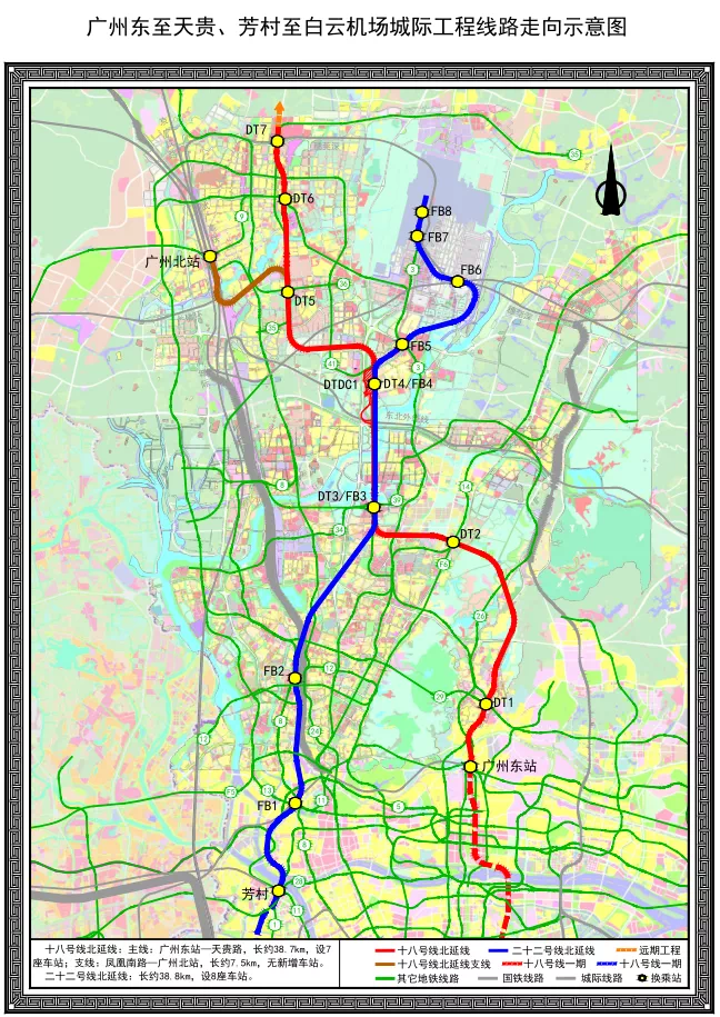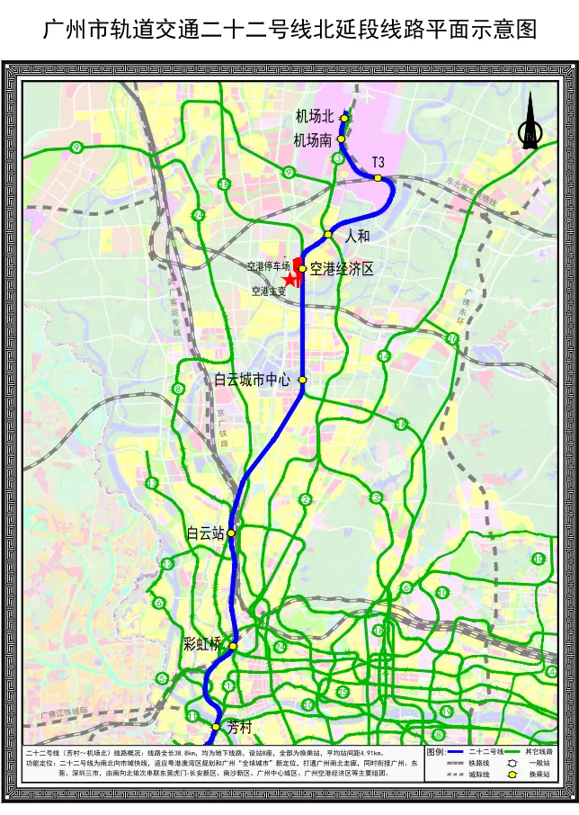 十八号线北延线主线全长约38.5km,为全地下敷设,设站7座,经天河区、白云区、花都区,串联同和总部服务区、京溪科技创新区、空港经济区、白云城市中心、空铁联合发展核心区、花都中心城区、融创文旅城片区等重点发展片区,均为换乘站,平均站间距5.5km。