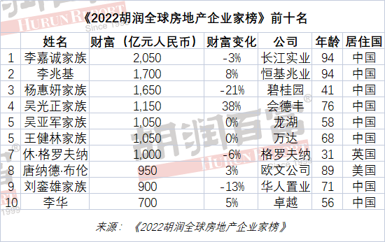 11位年龄不超过50岁,其中6位是白手起家的,5位是继承财富的。最年轻的是来自英国的31岁休·格罗夫纳,他是家族第八代,财富1000亿元;其次是新鸿基39岁的郭基辉,财富410亿元。