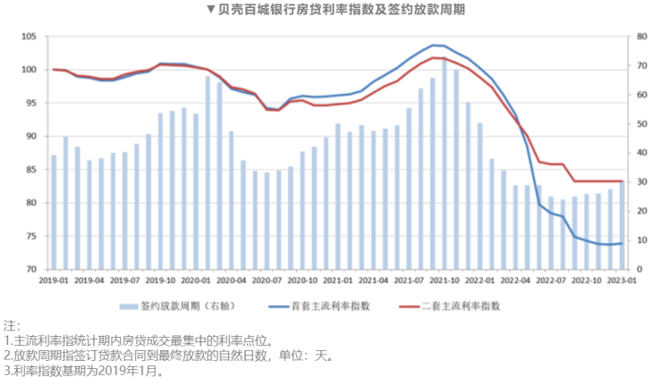 贝壳研究院1月17日发布的统计数据显示,2023年1月首套主流利率平均为4.10%,环比上行1BP,二套平均为4.91%,环比持平,同比分别回落146BP和93BP。