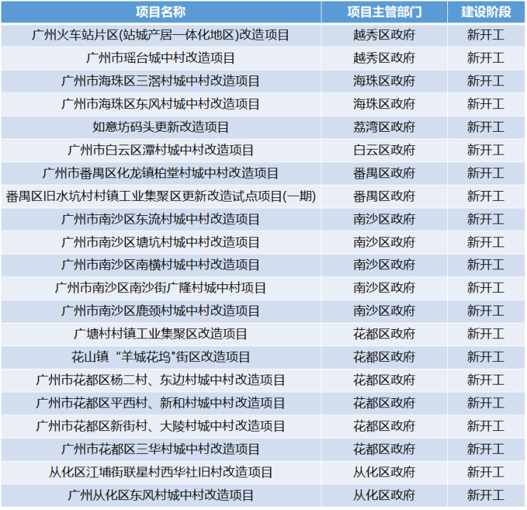 从项目清单来看,今年新开工的城中村改造项目主要集中在花都区(6个)和南沙区(5个),其中也包括了广州火车站片区、新中轴海珠片区、环五山创新策源区、罗冲围片区四大重点片区的首开区项目。
