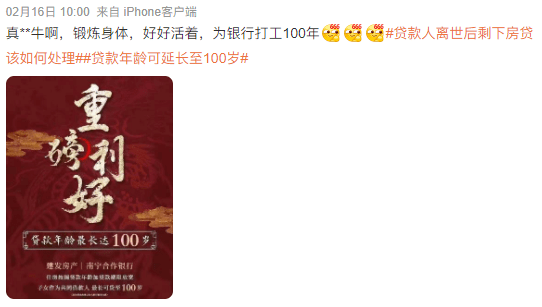 “按揭买房,房贷年龄可延长至100岁。”网友笑称,这才是真正的“贷贷”相传。