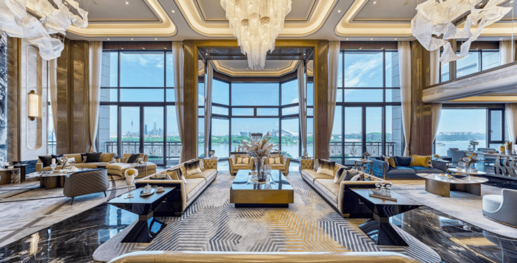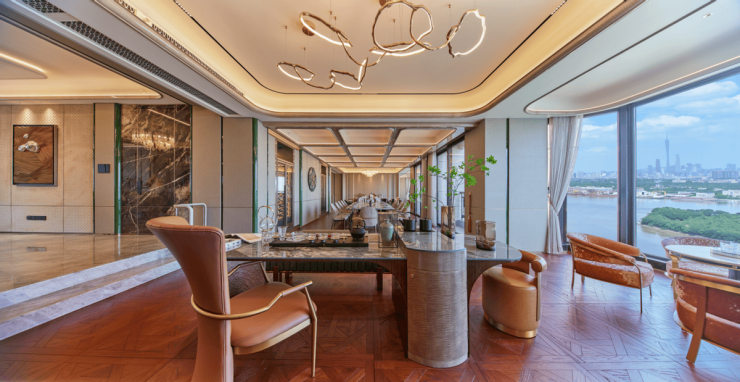 半岛五號从中国大家族的居住本质出发,用一场系统性的空间规划优化,回应家族生活的多元需求。建面约528㎡的大平层里,约17米的南向无界宽厅,将三江景致与城市天际线纳入日常视野;五套全功能套房在保障每位成员居住私密的同时,也为家族互动留足空间;近200㎡的会客区域,让家庭聚会拥有从容氛围。