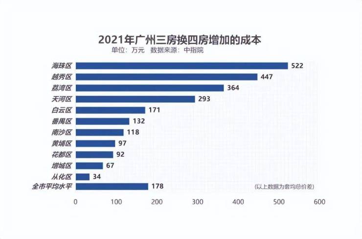 根据中指院数据显示,2021年在广州从三房换到四房,平均都要增加178万,在中心区更是两三百万起步,甚至高达五百多万。